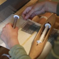 Once my warp is on the loom, I start weaving. I use a shuttle to transfer the weft yarn from one side to another through a shed. This is then compacted using a beater bar, and a new shed is opened. This process is repeated to create fabric.
